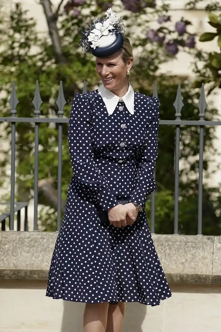 Prinses Anne was in Gatcombe Park gebleven, dochter Zara was met haar man Mike Tindall en hun oudste dochter Mia wel in de auto gestapt. Zara droeg een klassieke nopjesjurk van LB Bennett (het model is de Mathilde) en haar Aspinal of Londen clutch. Erbij de Josie Pumps. Het geval op haar hoofd is de Mrs B Hat van Justine Bradley-Hill.