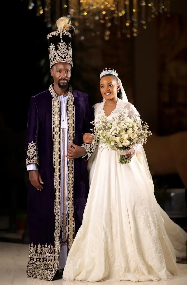 De bruidegom droeg bij het vertrek van Paleis Bugabula naar de kathedraal nog een traditioneel gewaad en een blazer, maar verruilde die laatste om voor een fraaie fluwelen mantel en dito geborduurd hoofddeksel.