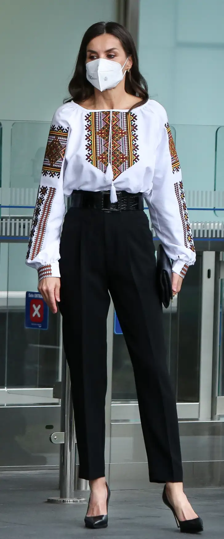 Koningin Letizia koos fashion om haar punt te maken. Voor een meeting van de Mutua Madrilena Foundation Grants for Social Projects in Madrid, combineerde Letizia een vyshyvanka blouse met traditioneel borduurwerk een zwarte broek. De vyshyvanka is een Oekraïens kledingstuk dat zowel door mannen als door vrouwen wordt gedragen en maakt al honderden jaren deel uit van de cultuur. Het borduurwerk is vaak uniek en zegt iets over de drager en de streek.
