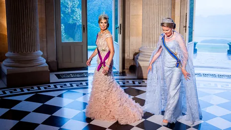 Staatbezoek van Nederland aan België, juni 2023. Dramatische bui op de achtergrond, paleis als decor, beeldschoon in een roze Taminiau en lichtblauwe Armani Privé