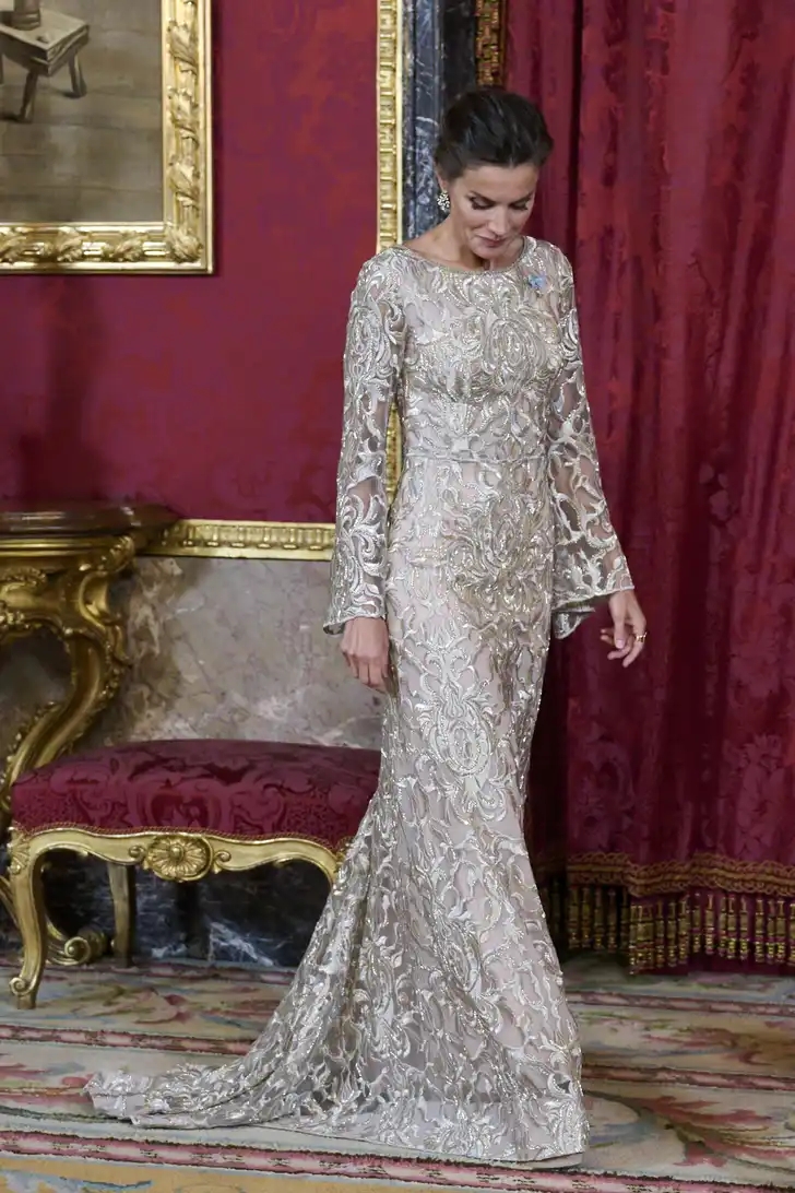 Als je ook zelf je ogen niet van je beeldige jurk kunt afhouden: koningin Letizia van Spanje.