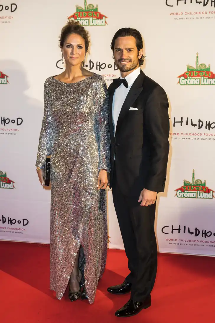 Prinses Madeleine van Zweden schitterde in 2019 naast haar broer Carl Philip in een jurk die van lamé gebreid lijkt te zijn.