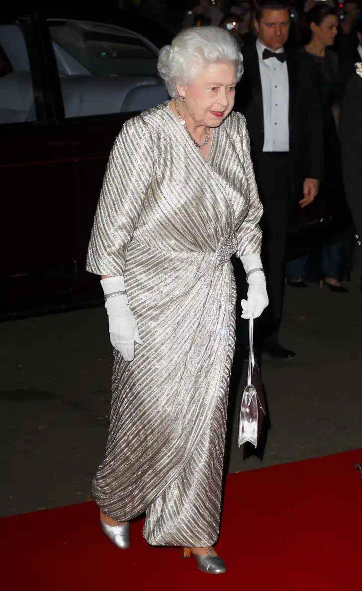 En koningin Elizabeth had ook deze wrap dress in de kast, voor een beetje glitter en glamour bij de Royal Variety Performance.