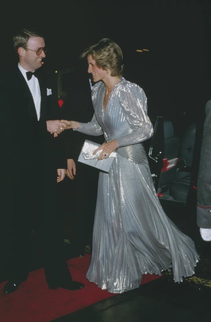 Ah, vintage zilver: prinses Diana in een Bruce Oldfield met pofmouwen en plissés, in 1985.