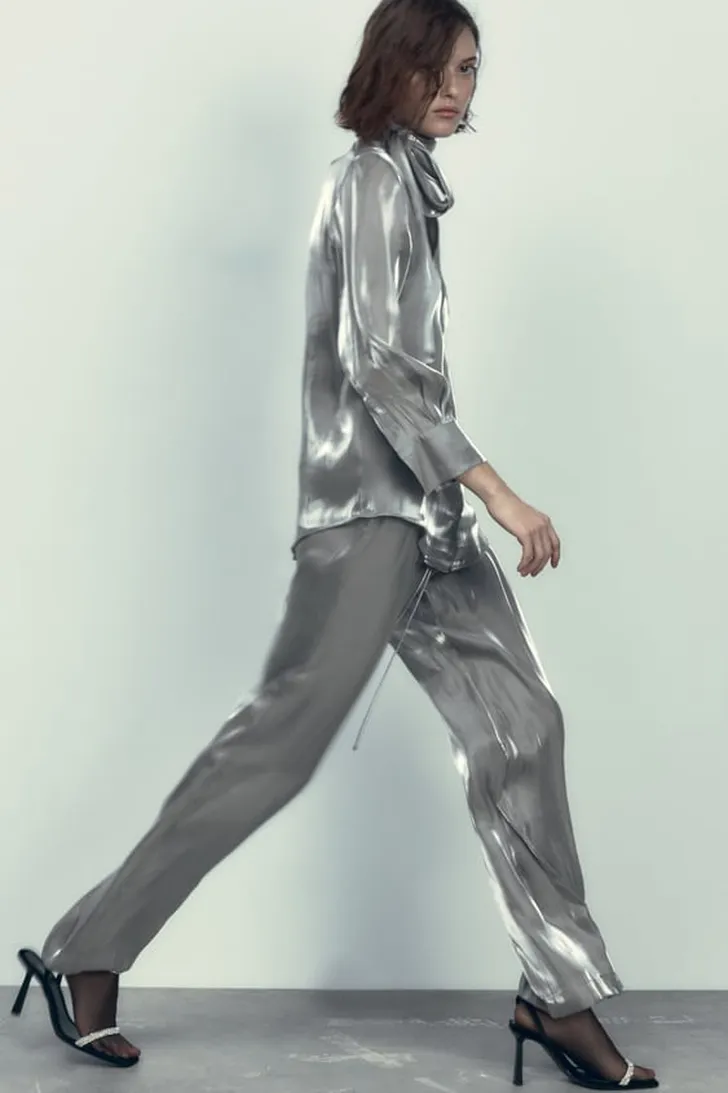 Blouse met strik in zilverglans, Zara € 70 (de broek is € 60)