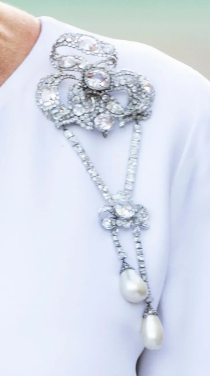 Máxima droeg de broche voor het eerst tijdens het huwelijk van prins Frederik en prinses Mary, mei 2004. De lange hangers van parel en diamant ontbreken.