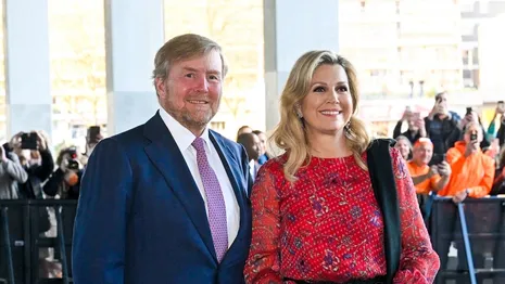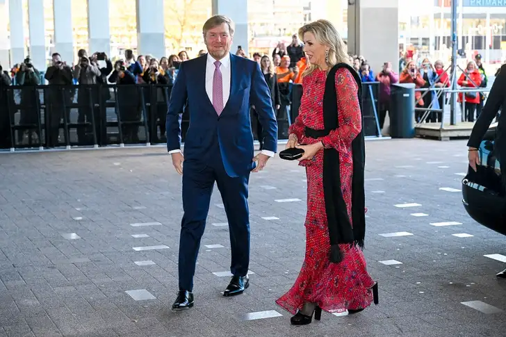 De koningin had zich feestelijk uitgedost in een rozerode jurk met strookjesrok…