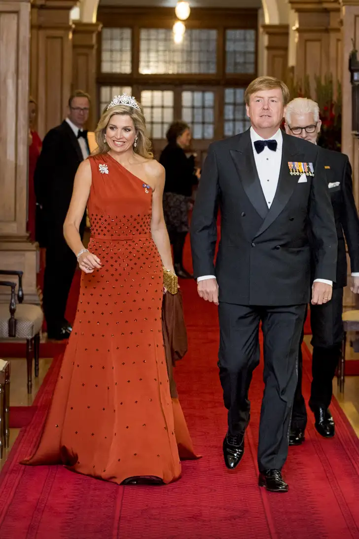De rode jurk van de Deens-Nederlandse ontwerper Claes Iversen is bewerkt met pailletten en heeft Máxima al eerder gedragen tijdens het staatsbezoek aan Denemarken in 2015. De tiara van koningin Máxima is het Harpdiadeem van koningin Emma. In 1890 was zij elf jaar getrouwd met Willem III en breidde haar collectie juwelen uit door deze prachtige diadeem aan te schaffen voor zo’n 50.000 gulden.