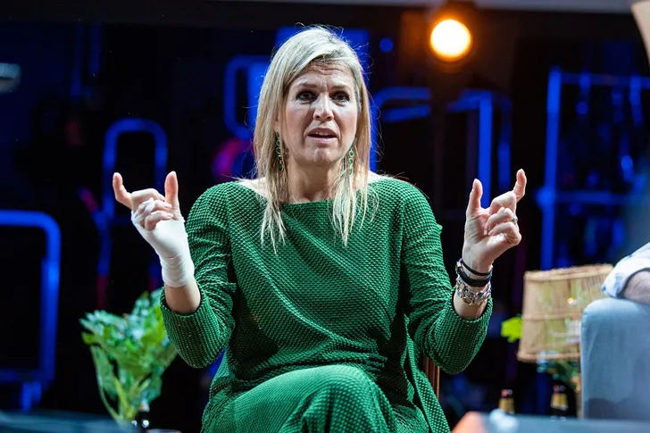 De reizende theatervoorstelling Time Out wil stress, burn-out en prestatiedrang bespreekbaar maken en was in coronatijd online via livestreams te volgen. Leuk dat HM de all-over groen look toch een beetje uitdaagde met suède laarzen die meer blauwgroen zijn.