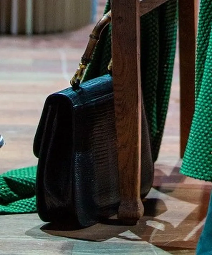 Ook mee: haar zwarte tas met bamboe hengsel van Susan Gail, die ze al 21 jaar heeft.