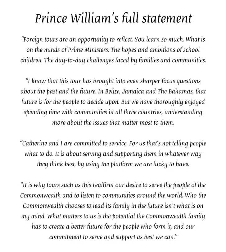 "Ik zal misschien nooit aan het hoofd staan van de Gemenebest staan," zei William aan het einde van de tour en erkende dat het 'vragen over het verleden en de toekomst nog scherper in beeld heeft gebracht."