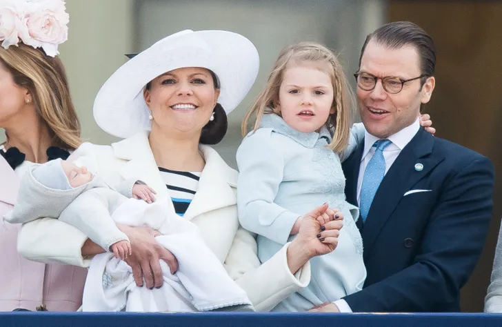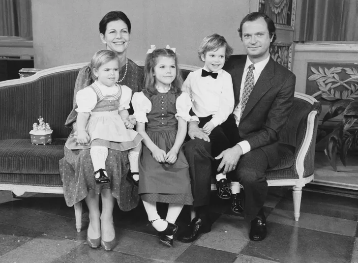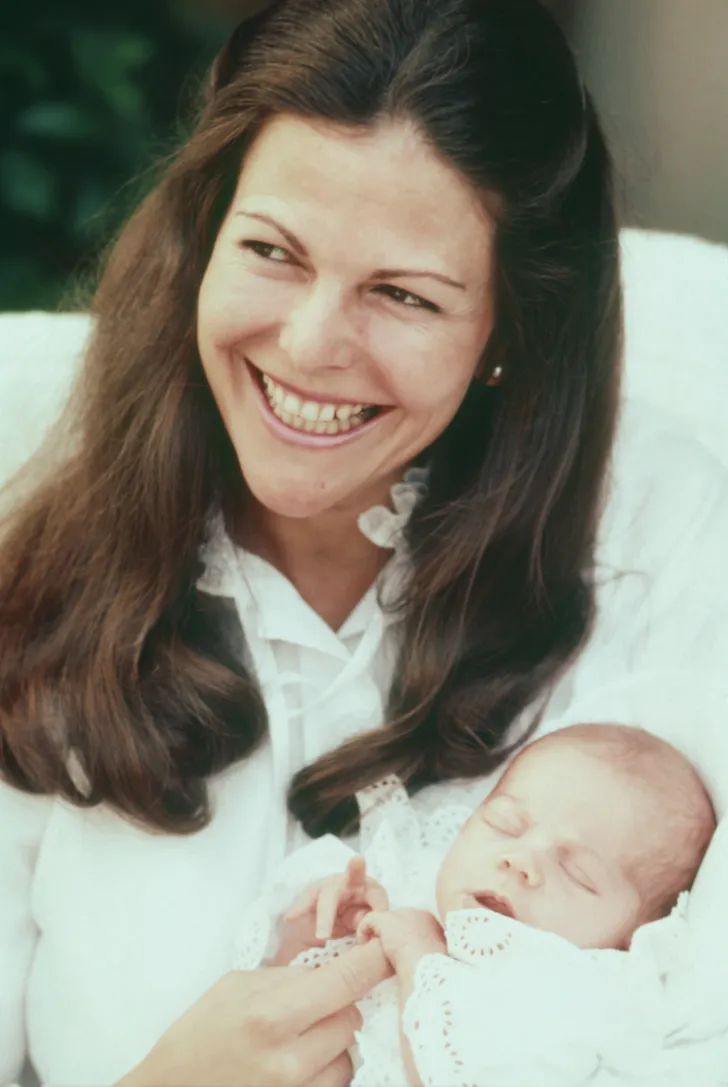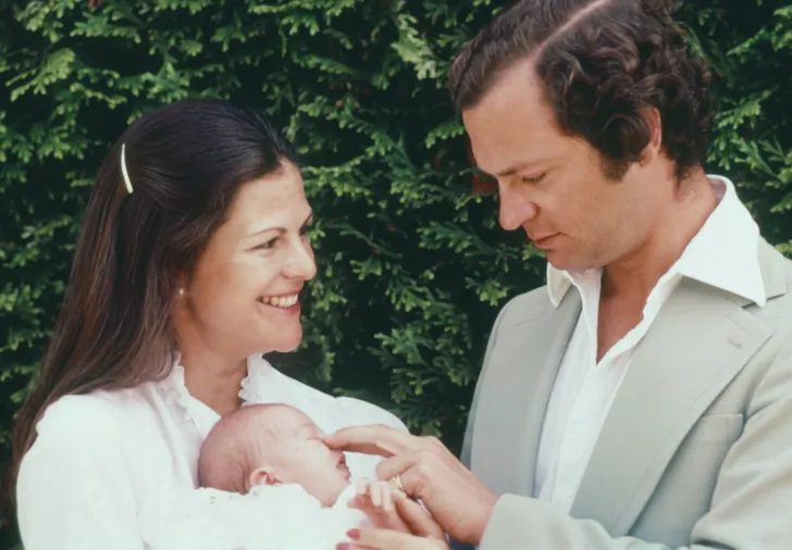 Koningin Silvia en koning Carl Gustav met baby Victoria, 1977
