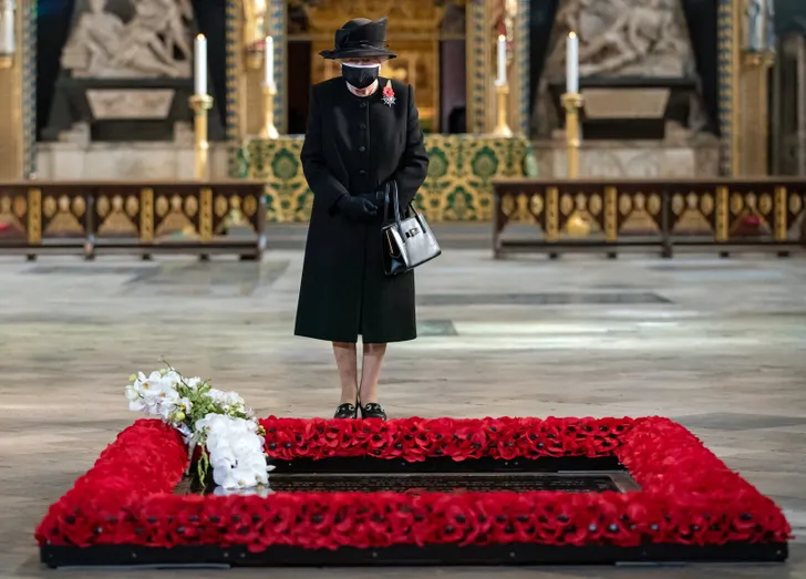 Koningin Elizabeth stond vorige week zelf al even stil bij de herdenking, met een niet aangekondigd bezoek aan het graf van de onbekende soldaat. In Westminster Abbey werd ze voor het eerst met een mondkapje gespot...