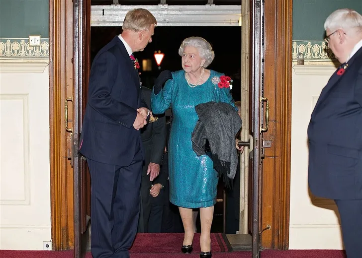 ...in 2014 droeg ze blauwgroen met glitters. It's good to be the Queen.