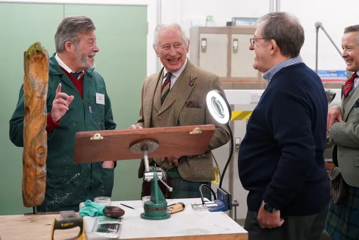 Charles III bezocht de Aboyne and Mid Deeside Community Shed in Aberdeenshire, passend Schots gestyled.