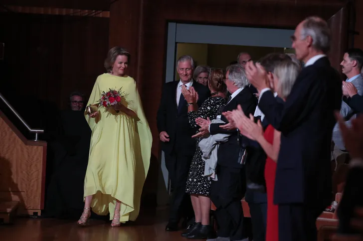 Hoe luid je een feestelijke Nationale Dag én tien jaar op de troon in? Nou ja, in geel dus. Koningin Mathilde verscheen aan de vooravond van haar jubileum als koningin in twee gele looks. Eerst een fladderende jurk…