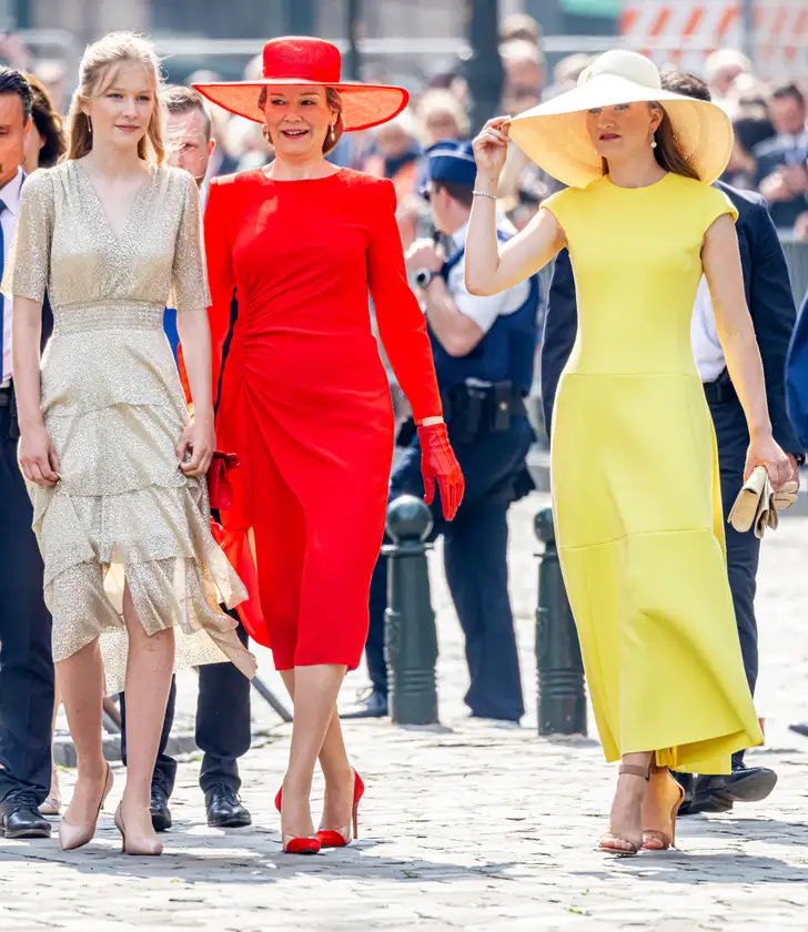 De nieuwste royally yellow look (een dag na haar moeder gedragen), want hoewel het afgelopen vrijdag tijdens de Belgische Nationale Dag sowieso nogal een modeparade was voor de kroonprinses, was dit toch echt een favoriete look van velen. De jurk is van NATAN, afgemaakt met een hoed van Fabienne Delvigne.