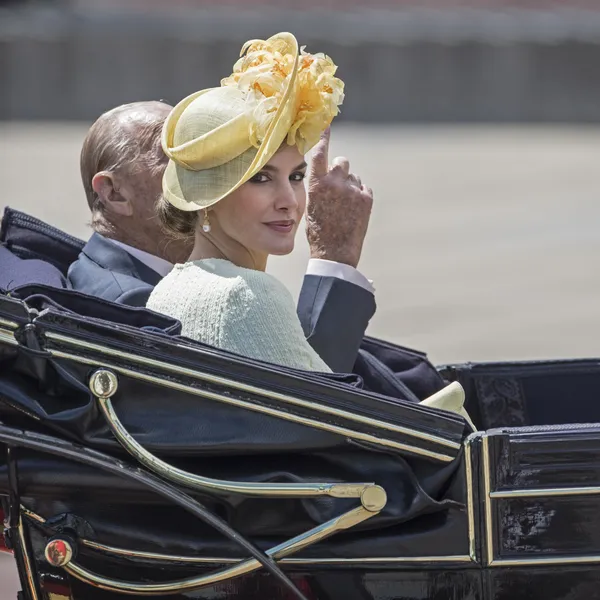 Natuurlijk waren Letizia en Felipe charmant als altijd. Zij breed lachend naast koningin Elizabeth, in de koets met prins Philip (die nog drie engagements te gaan heeft voor zijn pensioen), hij naast de mini-koningin (die met haar 1.57 toch wel een beetje afstak bij zijn 1.90 meter).
