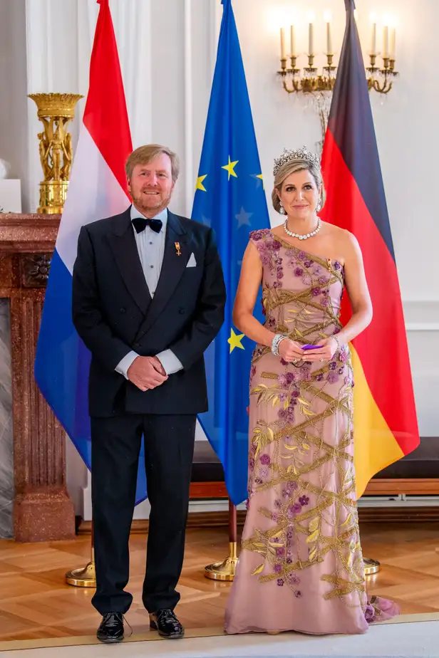 Om het rijtje af te sluiten, zetten we een wel heel bijzondere creatie in het zonnetje. Deze japon met goudkleurige accenten en paarse bloemen baseerde Jan Taminiau op het behang van paleis Huis ten Bosch. Máxima droeg de bijzondere creatie ter ere van de vijftigste verjaardag van Willem-Alexander. Blijkbaar viel de jurk in de smaak, want een jaar later draagt ze hem opnieuw voor de verjaardag van de Deense kroonprins Frederik.