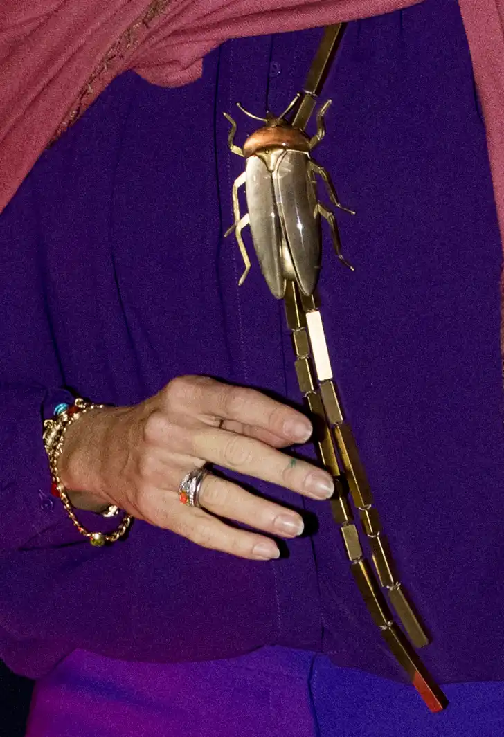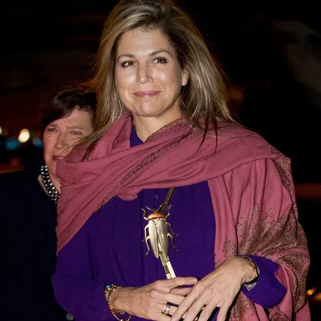 Het collier komt uit de nieuwe collectie van een van haar favoriete designers: Jan Taminiau. Die de koningin eerder dit jaar ook al eens van een flinke kever voorzag, toen in brochevorm