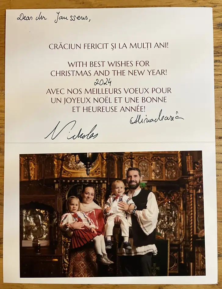Nicholas de Roumanie Medforth-Mills en zijn vrouw Alina doen er alles aan om de cultuur van hun land Roemenië te promoten, vandaar een kerstwens in klederdracht met hun kinderen Maria Alexandra en zoon Mihai.