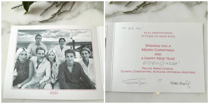 Kroonprinses Marie-Chantal van Griekenland stuurde deze kaart, zo te zien genomen op vakantie in Griekenland, met kroonprins Pavlos en al hun inmiddels zo goed als volwassen kinderen om zich heen.