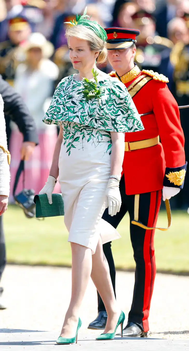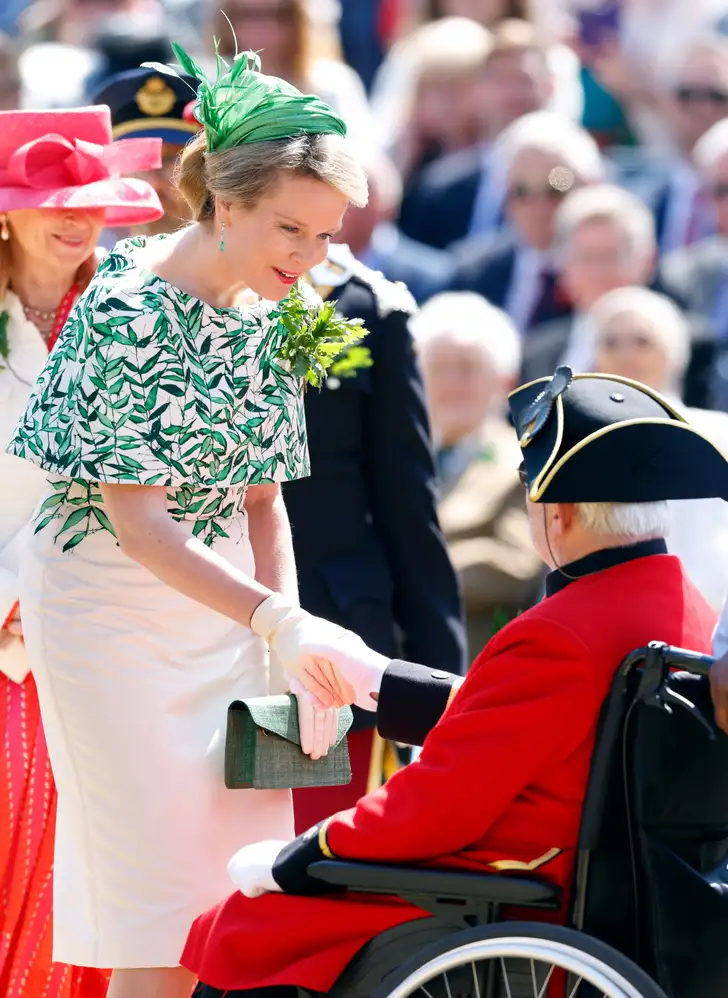 Dat is allemaal plechtig en prachtig, maar het was toch Mathilde's look die de show stal in haar nieuwe Natan met bladerprint. "Het kan bijna geen toeval zijn dat de Koningin net voor deze jurk heeft gekozen, want de Founder’s Day staat ook wel bekend als Oak Apple Day," aldus Jelka Van Duyse van Garderobe Royale.