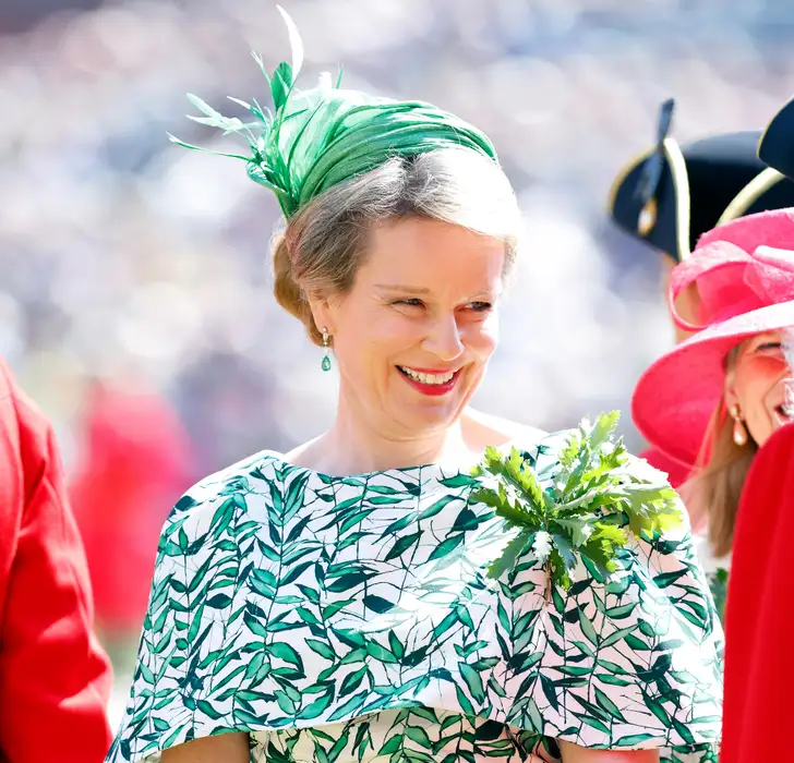 Koningin Mathilde droeg er een groene hoed bij, die toepasselijk de ‘Chelsea’-hoofdtooi werd genoemd door Fabienne Delvigne. Zij maakte deze met bananenvezels en zijde, en verder versierd met veren in twee tinten groen.