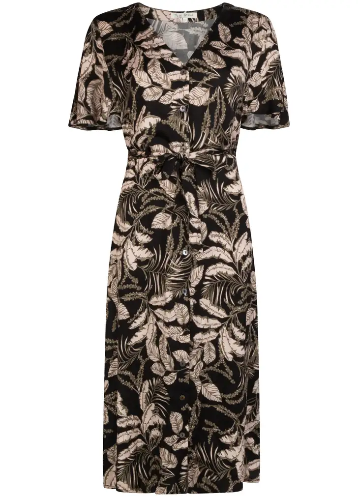 Natuurprints zijn hot deze zomer, van tropisch en vrolijk tot subtiel. Deze mooie doorknoopjurk van Tramontana past uitstekend in deze trend en mag dit seizoen niet ontbreken in je garderobe. De jurk valt net iets onder de knie en is afgewerkt met knoopjes aan de voorzijde. Hij zit supercomfortabel dankzij de zachte viscose en het koordje in de taille zorgt voor een vrouwelijk silhouet.